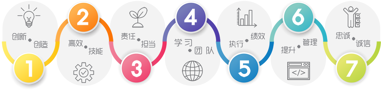 {创新/创造}:追求创新能力,发掘自身创造能力;{高效/技能}:不断提升自身技能,工作高效;{责任/担当}:对企业、社会有责任感,自身有担当;{学习/团队}:不断加强自身学习,对团队有归属感;{执行/绩效}:执行力充分,追求绩效提升;{提升/管理}:不断提升管理能力;{忠实/诚信}:对企业忠诚,对自身要求诚信